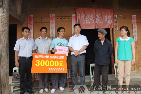 领导在与文钟浒交谈。广西新闻网通讯员 陈秀琴 摄 广西新闻网乐业8月28日讯(通讯员 陈秀琴)日前,乐业县委、政府为考取北京大学贫困学生文钟浒捐赠爱心助学款30000元,帮助贫困学子圆大学梦。 乐业县贫困学子文钟浒,今年高中毕业,以621分的高分被北京大学录取,这个好消息传遍了花坪镇岜木屯小山村,乡亲们纷纷夸奖他有出息。可是由于家庭困难,文钟浒家难以支付这笔高昂的学费,文家在高兴的同时,也多了一份忧愁。文钟浒的父母都是忠厚老实的庄稼人,家庭经济比较困难。得知这一情况,8月25日,县委常委、宣传部部长、副县长黄维新率领县教育局局长、花坪镇镇长等领导,前往文家祝贺,并代表县委、县人民政府给文钟浒送去30000元爱心助学金,希望他能安心学习,县委政府将尽最大努力帮助他完成学业。 收到政府送来的助学金,文钟浒激动的说:“有党委政府的关爱我一定会更加刻苦学习,练好本领汇报社会,不辜负领导的关爱、父母的期望!”据了解,文钟浒是乐业县本土第一个考取北大的学子。 |